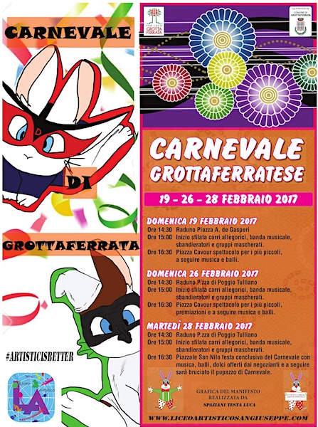 Il Carnevale Grottaferratese 2017 porta tutta la sua allegria a Grottaferrata domenica 19, domenica 26 e martedì 28 febbraio 2017.