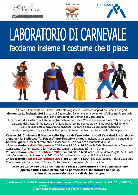 Casalecchio Insieme e il Gruppo delle Signore dell’uso e del riuso di CasaMasi in collaborazione con la Biblioteca “C. Pavese” e Casalecchio delle Culture per il sesto anno, vi invitano a partecipare ai seguenti laboratori gratuiti per realizzare abiti e maschere di Carnevale con materiale di riuso: