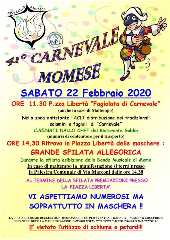 La Pro Loco di Momo invita sabato 22 febbraio 2020 a partecipare agli eventi del 41° edizione del Carnevale Momese con la tradizionale fagiolata, le sfilate di maschere e musica in piazza per fare festa.
