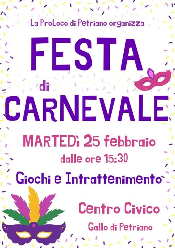 La Pro Loco Petriano vi aspetta con la Festa di Carnevale presso il centro civico di Gallo Martedì 25 Febbraio 2020 alle ore 15.30.