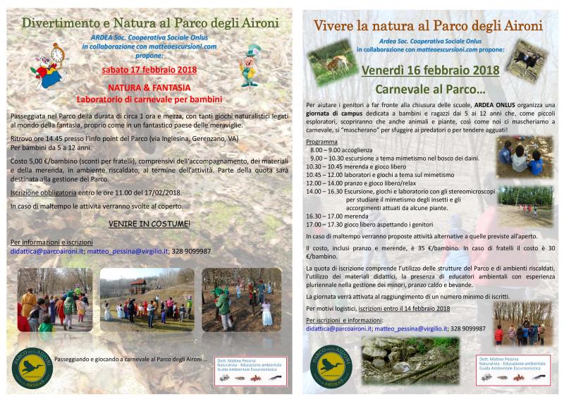 Gerenzano (VA) Al Parco degli Aironi due belle iniziative in occasione del Carnevale. La prima venerdì 16 febbraio 2018, per aiutare i genitori a far fronte alla chiusura della scuole, ARDEA ONLUS organizza una giornata di campus dedicata ai bambini dai 5 ai 12 anni, che come piccoli esploratori, scopriranno che anche animali e piante, così come noi ci mascheriamo a Carnevale, si mascherano per sfuggire ai predatori o per tendere agguati.