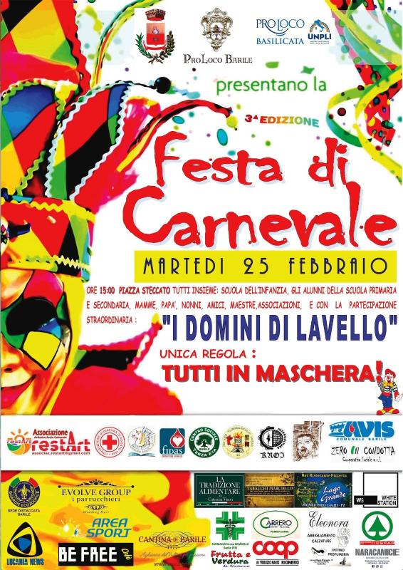 Il Comune di Barile (PZ) con la Pro Loco Barile e la partecipazione Attiva di tutte le Associazioni Culturali della Comunità di Barile presentano la 3a Edizione della Festa di Carnevale.