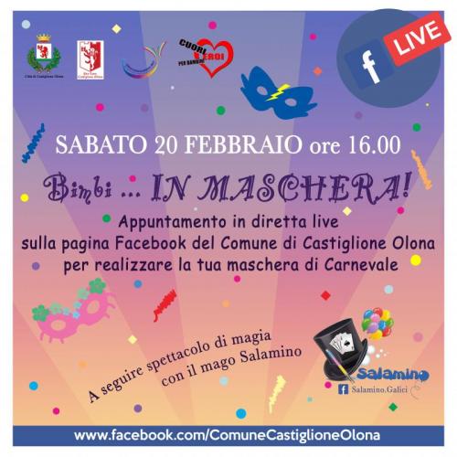 L'appuntamento con la diretta avrà inizio alle ore 16.00 su www.facebook.com/ComuneCastiglioneOlona in compagnia di Creatori di Sorrisi - Varese che ci guideranno passo passo nella realizzazione di una splendida mascherina di carnevale, pronta per essere indossata e sfoggiata, per chi lo vorrà, nella speciale galleria fotografica che il Comune pubblicherà sulla propria pagina social. Il divertimento però non si ferma qui perché a seguire, grazie all'Associazione Cuori Eroi per i Bambini Eroi, sarà di scena il Mago Salamino che intratterrà grandi e piccini con il suo strepitoso spettacolo di magia.