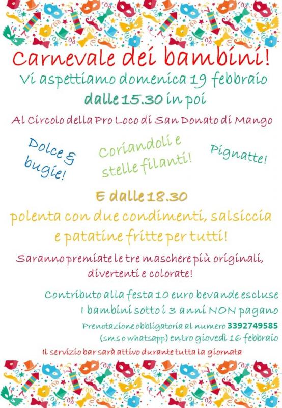 Domenica 19 febbraio invece, presso la sede della Pro Loco di san Donato di Mango, a partire dalle ore 15.30 avrà inizio il “Carnevale di bambini”, con intrattenimento, merenda con pane e nutella, bugie, marshmallows e altro, giochi, musica e cotillons. Saranno premiate le tre maschere più originali, più colorate e più divertenti. Sarà attivo anche il servizio bar per gli adulti. Previsto un contributo alla festa di 10 euro a bambino.