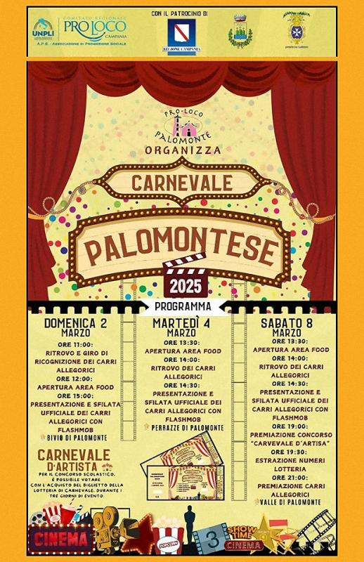 “L’arte teatrale nello storico carnevale palomontese per raccontare le emozioni e i sani valori attraverso la rievocazione delle scene dei film più belli del cinema”. Racconta così, la scelta del tema “Sotto i riflettori per un Carnevale da Oscar”, l’attore del cinema italiano e volto noto della tv Simone Gentile, l’evento dello storico carnevale palomontese che si svolgerà nei giorni 02 Marzo a partire dalle ore 11.00 in località Bivio, il 04 Marzo a partire dalle ore 13.30 in località Perrazze e l’8 marzo a partire dalle ore 13.30 in località Valle, nel comune di Palomonte, nel salernitano.