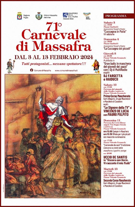In tutto il periodo carnascialesco, nella nostra bellissima città di Massafra, città della Civiltà Rupestre, si respira l'attesa per i grandiosi corsi mascherati.