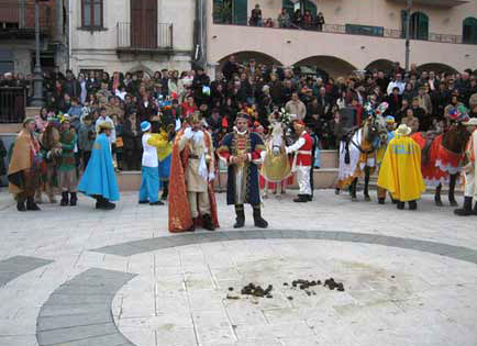 I dodici mesi distinti da un mascheramento referenziale allegorico, realizzato con soluzioni povere ma di grande efficacia visiva ed evocativa, un tempo in groppa a degli asini e oggi su cavalli, anche loro bardati a festa, e accompagnati dai loro attendenti, giungono in piazza. Qui, a turno, con fare minaccioso si rivolgono al Re (Principi, Re e Cavalieri) e, dopo, aver vantato i privilegi insuperabili che recano al benessere della comunità, chiedono, nella provvisoria inversione dei ruoli che mette in crisi l'autorità costituita, in maniera perentoria ed esclusiva la corona, espressione massima dei potere. Spetterà al Poeta, alla fine delle appassionate perorazioni dei Mesi, il compito di ricomporre l'insanabile conflitto, ristabilendo così le consolidate certezze del vivere quotidiano,... Siete come la fame con la sete/e l'uno e l'altro non vi dis'amate/va bene che il mondo sostenete/ma un solo Dio regna in Trinitate... Il Re, dal canto suo, invita alle danze l'inquieto corteo dei Mesi,... Fra suoni e balli ci abbiamo scialato, ognuno bada per darsi aiuto.... La parte finale del copione, che chiude e suggella il cerchio allegorico del cerimoniale, è recitata dal cosiddetto Borghese, una sorta di io narrante, identificatile con l'autore dei versi, che esalta la figura del Re e non solo quella allegorica, ma anche quella storica.