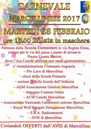 Si ringrazia per la realizzazione dell’evento la Pro Loco di Marcellina, le insegnanti e gli alunni che hanno aderito all’iniziativa, l’AGM Associazione Genitori Marcellina, l’associazione Impegno Comune Onlus, l’ACM Associazione Cuochi Marcellina, l’Associazione Nazionale Carabinieri – Sezione Marcellina, i Royal Wolf Rangers Delegazione Marcellina, l’associazione E.R.A. Radioamatori e l’AVIS di Marcellina, che offrirà I coriandoli ai bambini presenti.