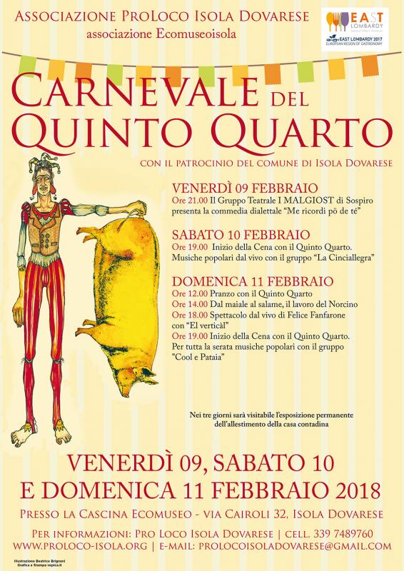 Il Carnevale del Quinto Quarto si rifà essenzialmente all’uso delle parti povere del maiale nella cucina tradizionale padana. Per parti povere si intendono le frattaglie, il fegato, il cuore, i piedi, le cotiche, la lingua, i reni, ecc, tutto ciò che, nella necessità del mondo rurale, aveva un valore quasi paragonabile alle parti più nobili e pregiate dell’animale.