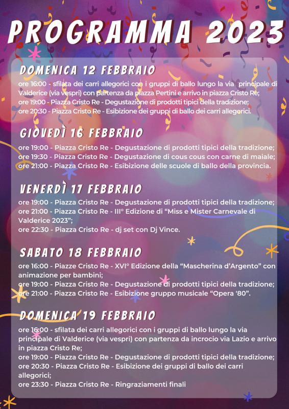 Dal 12 al 19 Febbraio 2023 si terrà a Valderice la 28a edizione del Carnevale di Valderice.