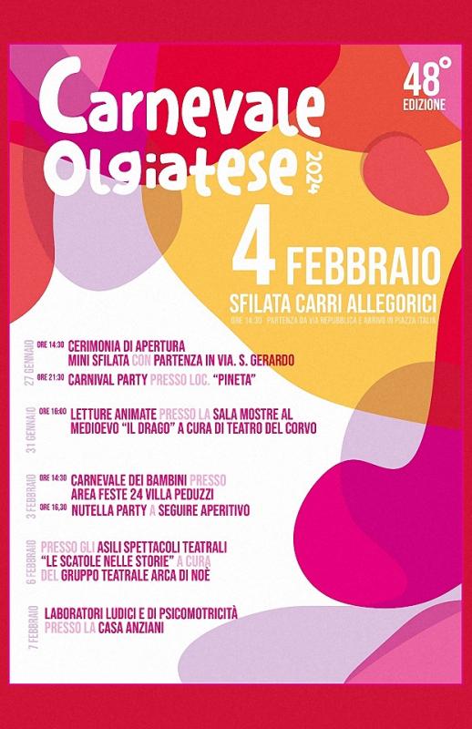 A Olgiate Comasco in provincia di Como si svolge nei giorni 27, 31 Gennaio, 03, 04, 06, 07 Febbraio 2024 la 48a Edizione del Carnevale Olgiatese.
