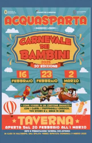 La XXX edizione del "Carnevale dei bambini di Acquasparta" vi da appuntamento a Domenica 16 Febbraio, Domenica 23 Febbraio e Domenica 2 Marzo (in caso di maltempo una sfilata verrà recuperata domenica 9 Marzo) a partire dalle ore 14:30 con la grande sfilata dei carri allegorici.