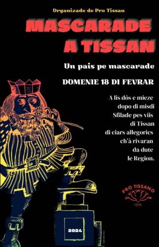 Domenica 18 Febbraio 2024, alle ore 14,30, torna la Mascherata a Tissano, frazione del comune di Santa Maria la Longa (UD), per festeggiare il carnevale con i tradizionale sfilata carri allegorici provenienti da tutta la Regione.