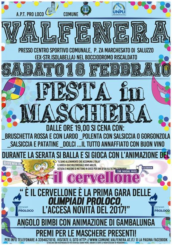 La Pro Loco di Valfenera è lieta di invitarvi allaserata di Carnevale!Il 18/02 vi aspettiamo nel bocciodromo di Valfenera per una serata per uttti i gusti!Una serata in maschera all'insegna del divertimento da 0 a 99 anni:l'animazione di gambalunga per i più piccini,il quiz del Cervellone per le menti più scoppiettanti,la presentazione delle maschere con premiazione di quelle più creative ed originali,polenta, bruschette e buon vino,e..grande novità del 2017, una competizione riservata alle Pro Loco: 6 Pro Loco amiche si sfideranno durante la serata...Venite anche voi a divertirvi!
