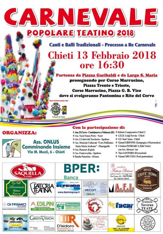 Anche quest'anno la Città di Chieti, martedì 13 Febbraio dalle 16. 30, sarà animata dal Carnevale Popolare Teatino, organizzato dall'Associazione Camminando Insieme di Chieti, giunto alla XII edizione.