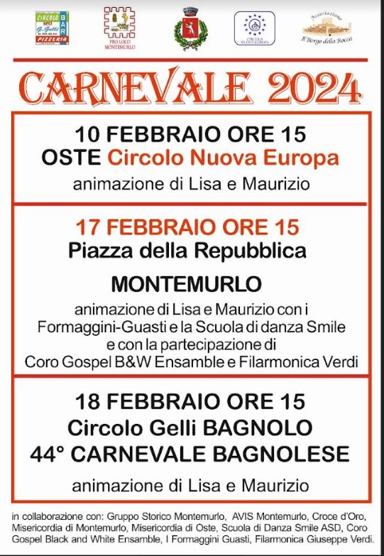 A far divertire le maschere ci saranno la Filarmonica Verdi, il gruppo teatrale dei Formaggini Guasti, la Scuola di Danza Smile, musica con Dj set e il coro gospel Black & White.