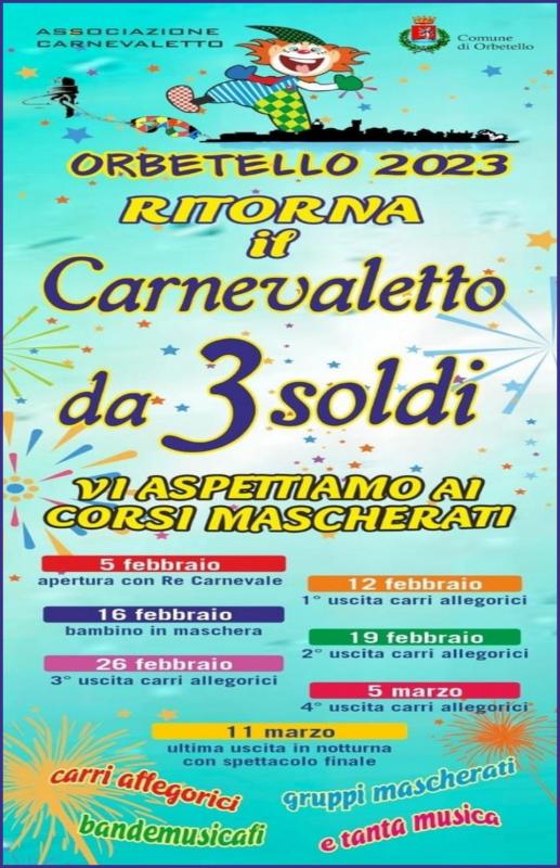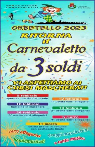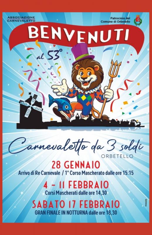 La 53a edizione del Carnevaletto da 3 Soldi ad Orbetello si svolgerà nei giorni da Domenica 28 Gennaio a Sabato 17 Febbraio 2024.