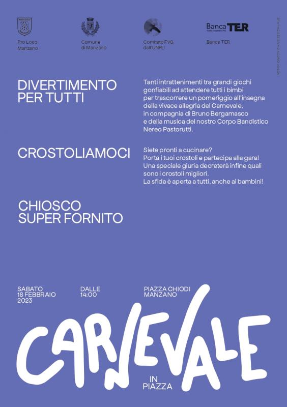 Tradizionale Carnevale Manzanese Sabato 18 Febbraio, dalle ore 14.00, vi aspettiamo in Piazza Chiodi per festeggiare il Carnevale assieme a noi.