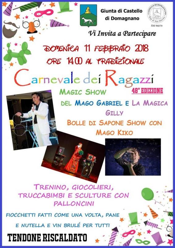 La Giunta di Castello di Domagnano vi invita a partecipare Domenica 11 Febbraio dalle ore 14.00 alla 48^ edizione del Carnevale dei Ragazzi.