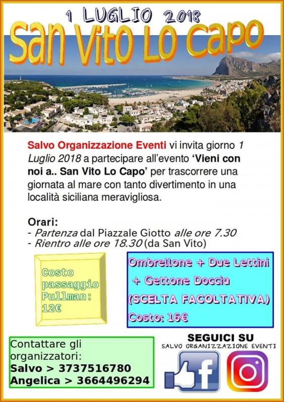 Salvo Organizzazione Eventi vi invita il giorno 01 Luglio 2018 a partecipare all'evento "Vieni con noi a...San Vito Lo Capo" per trascorrere una giornata al mare con tanto divertimento in una località siciliana meravigliosa.