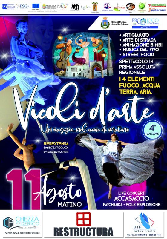 Il Comune di Matino – Assessorato alla Cultura – la Regione Puglia , Il Teatro Pubblici Pugliese e la Proloco Sant’ Ermete Matino con la collaborazione dell’ l’Istituto Statale Comprensivo Matino e le associazioni “Matinum” e gli “Amici del Presepe” sono lieti di presentare la IV edizione di VICOLI D’ARTE 2019 che negli anni precedenti ha riscontrato un notevole successo con oltre 15.000 presenze.