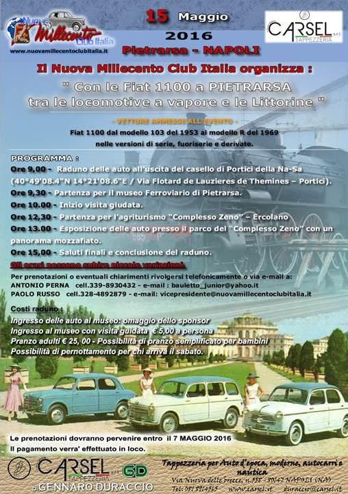 Il Nuova Millecento Club Italia ha organizzato per domenica 15 maggio 2016 un raduno interamente dedicato alle Fiat 1100 d'epoca.