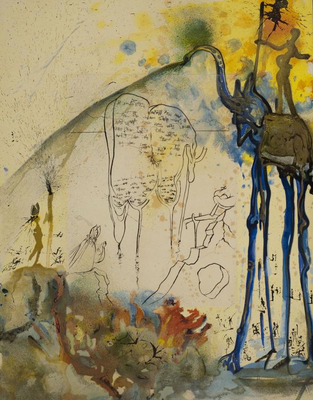 Si prosegue con le illustrazioni per “Moïse et monothéisme”, l’ultima opera di Sigmund Freud, in cui lo psicanalista esamina la natura delle religioni monoteiste, la figura di Mosè in relazione alla teoria sul complesso di Edipo e le similitudini che intercorrono tra figura paterna e divinità. Dalí, da sempre affascinato dalla psicanalisi freudiana, nel 1975 crea 10 litografie incise su lastre d’oro e stampate su pelle di pecora, dove intreccia figure erotiche con simboli primitivi, illustrando molti credo di religioni diverse e immagini che rappresentano l’ipotetico Mosè non ebreo di Freud, liberatore degli ebrei dalla schiavitù.