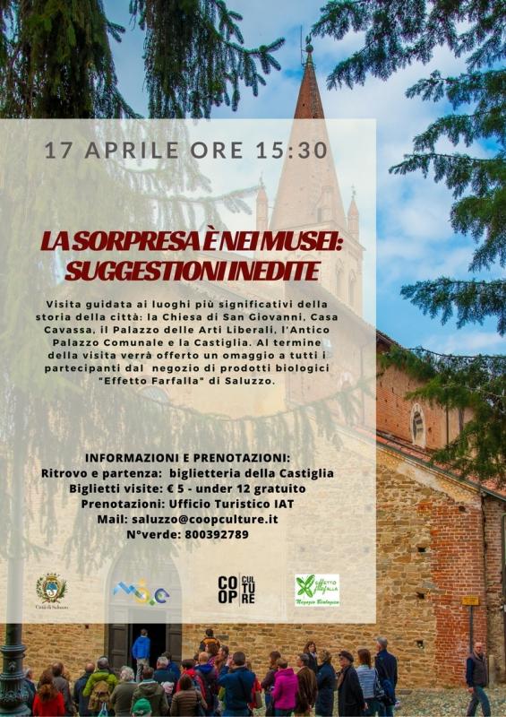 Alle ore 15.30 si partirà dalla Castiglia per scoprire “Saluzzo: suggestioni inedite”. A fine visita i partecipanti riceveranno un omaggio fornito dal negozio di prodotti biologici "Effetto Farfalla" di Saluzzo.