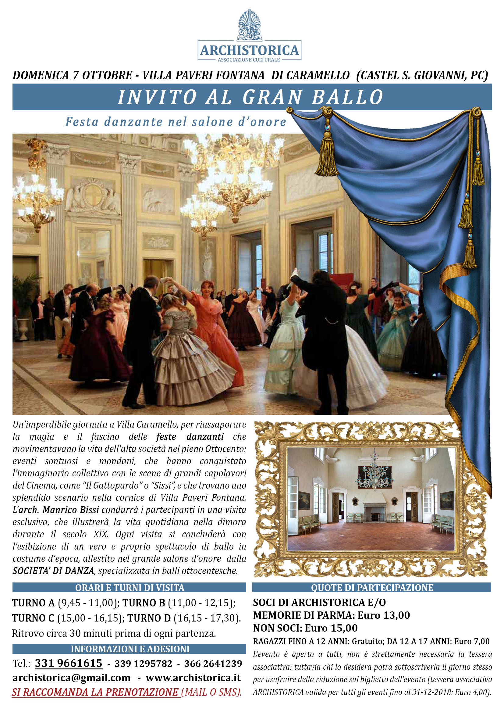 Un’imperdibile giornata a Villa Caramello (Castel San Giovanni, PC), per riassaporare la magia e il fascino delle feste danzanti che movimentavano la vita dell’alta società nel pieno Ottocento: eventi sontuosi e mondani, che hanno conquistato l’immaginario collettivo con le scene di grandi capolavori del Cinema, come “Il Gattopardo” o “Sissi”, e che trovano uno splendido scenario nella cornice di Villa Paveri Fontana. L’arch. Manrico Bissi condurrà i partecipanti in una visita esclusiva, che illustrerà la vita quotidiana nella dimora durante il secolo XIX.