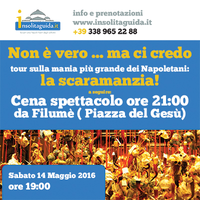 Un Sabato dedicato alla più grande mania dei napoletani: la scaramanzia e alle storie e storielle di spiriti e spiritelli che ruotano intorno alla tradizione napoletana. Questo è quello che promette l’associazione culturale Insolitaguida per Sabato 14 Maggio 2016 con un doppio evento: passeggiata narrata e cena-spettacolo.