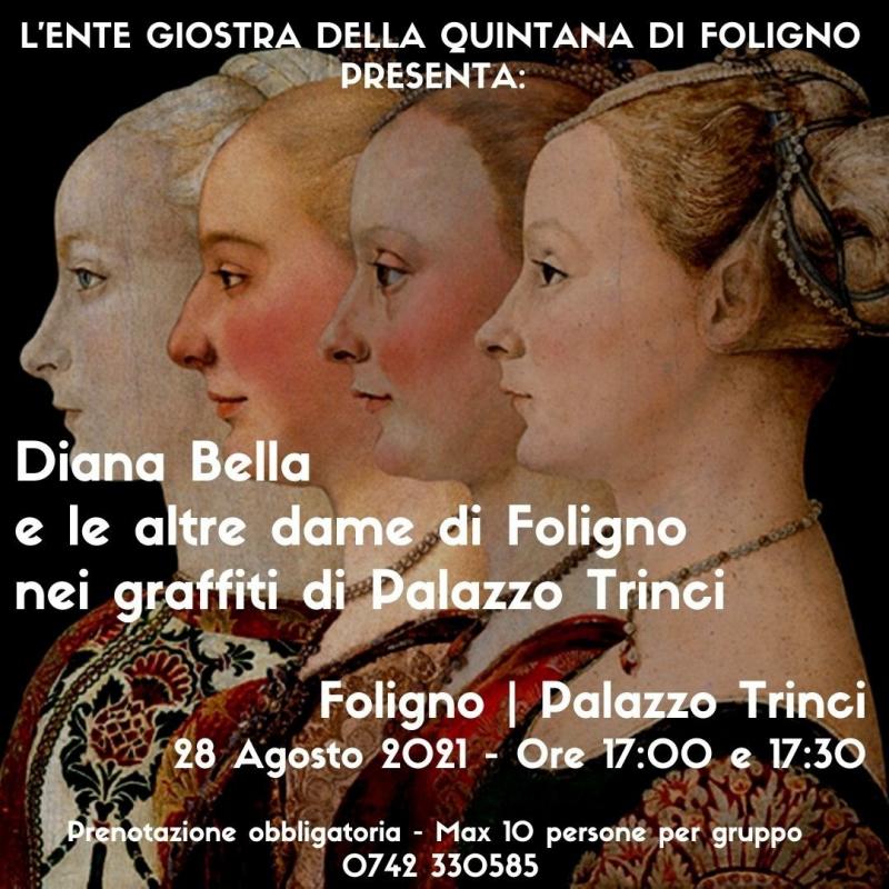 Diana Deli di Giovan Francesco Averardi detta non a caso, Diana Bella era una sorta di “diva del medioevo” che – si narra – fece girar la testa a nobili, popolani, forestieri e persino al Papa. Della bellezza delle donne di Foligno c’è traccia nelle secolari mura dello storico Palazzo Trinci. Allora era in voga incidere sui muri alcuni pensieri e frasi in forma di graffiti. A Palazzo Trinci, dalla famosa Scala Gotica alla Sala dei Giganti è un tripudio di nomi femminili vergati in epoche diverse. Gli uomini che hanno soggiornato o sono semplicemente transitati all’interno del palazzo hanno inciso sui muri i nomi delle donne amate, desiderate, ammirate per la loro bellezza. Ma la figura femminile che emerge è la bella Diana. Ludovico Jacobilli, negli Annali di Foligno scrive che nell’anno 1505, il 9 agosto, moriva Diana, figlia di Giovan Francesco Averardi e moglie di Giovan Francesco Deli, detta Diana Bella per la sua straordinaria avvenenza, aggiungendo che era dotata di una carnagione così delicata e quasi diafana che allorché beveva il vino rosso le traspariva dal collo. Niccolò Alunno, dovendo dipingere nel 1475 una Madonna, sulla parete di una casa vicina alla chiesa di Sant’Agnese in via dei Monasteri, usò come modello Diana Deli e l’immagine affrescata piacque tanto che fu trasportata in chiesa, dove, a seguito delle grazie concesse, venne collocata sull’altare maggiore. L’apologia di Diana Bella fatta dai suoi ammiratori sopravvive in numerosi graffiti nella Sala degli Imperatori e nel Corridoio di collegamento di Palazzo Trinci con la Cattedrale.