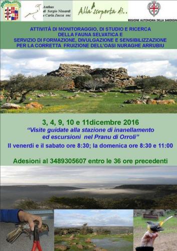 Nell'ambito del Progetto " ATTIVITÀ DI MONITORAGGIO, DI STUDIO E RICERCA DELLA FAUNA SELVATICA E SERVIZIO DI FORMAZIONE, DIVULGAZIONE E SENSIBILIZZAZIONE PER LA CORRETTA FRUIZIONE DELL’OASI NURAGHE ARRUBIU", il 27 e 28 Febbraio; 4, 5 e 6 Marzo 2016 sarà possibile partecipare allevisite guidate presso la Stazione di inanellamento degli uccelli selvatici ad escursioni sul Prano di Orroli.