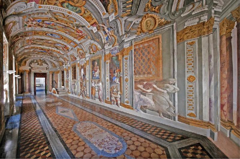 Tutti conoscono gli effetti speciali creati da Andrea Pozzo nel dipingere la finta cupola della chiesa di Sant’Ignazio. Ma ben pochi sanno che il frate pittore, prima di dedicarsi a questa cupola, realizzò un’opera ancor più stupefacente: gli affreschi del corridoio che introduce alle quattro stanzette della Casa professa dei gesuiti, a fianco della chiesa del Gesù, dove Ignazio di Loyola visse negli ultimi anni e dove morì nel 1556. Le camere di sant’Ignazio sono precedute da un corridoio con decorazione prospettica di Andrea Pozzo e affreschi del Borgognone.