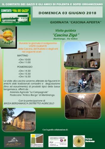Le visite guidate alla Cascina Zigò (via Vallere, Martinengo) saranno gratuite e riguarderanno l'edificio della cascina, con riferimenti storico architettonici e visita al frutteto adiacente alla struttura. Le visite si terranno nella mattinata alle ore 10 e alle ore 11, mentre nel pomeriggio si terranno alle ore 14.30, 15.30 e 16.30.