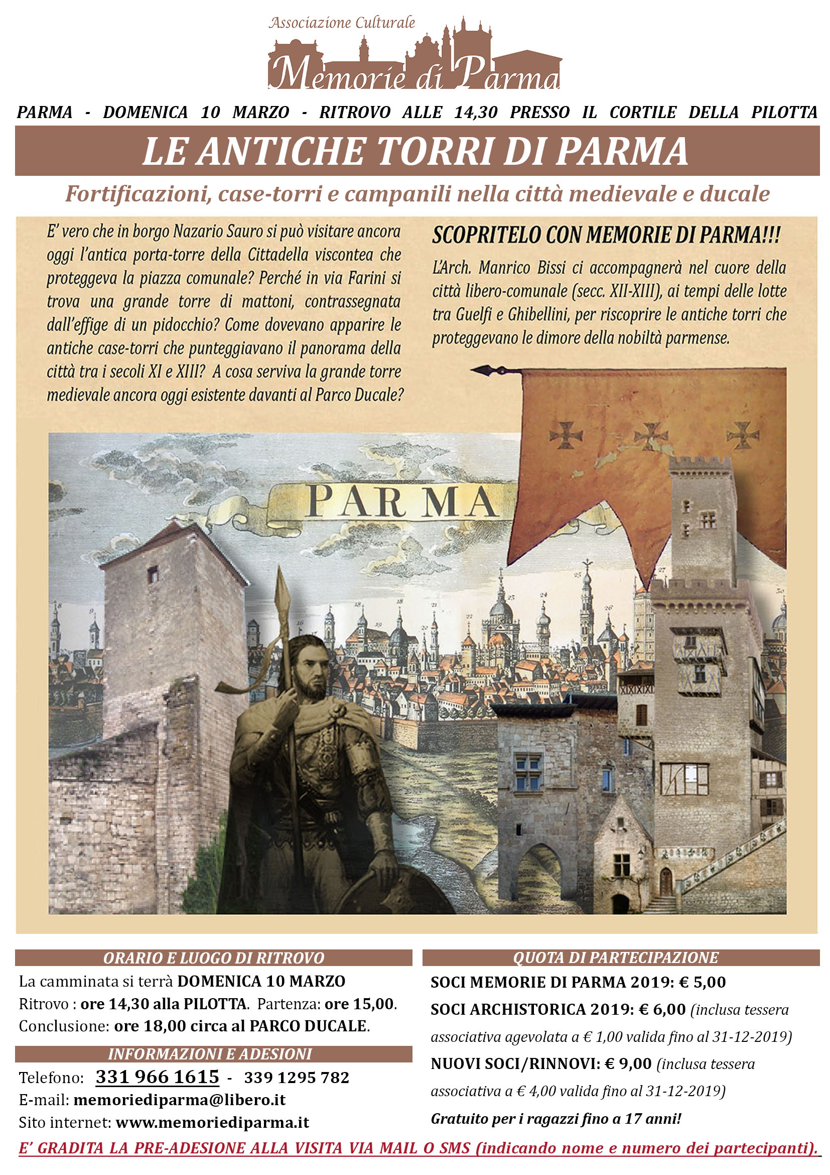 E’ vero che in borgo Nazario Sauro si può visitare ancora oggi l’antica porta-torre della Cittadella viscontea che proteggeva la piazza comunale? Perché in via Farini si trova una grande torre di mattoni, contrassegnata dall’effige di un pidocchio? Come dovevano apparire le antiche case-torri che punteggiavano il panorama cittadino tra i secoli XI e XIII? A quali funzioni rispondevano? A cosa serviva la torre medievale ancora oggi esistente sul lungo-Parma, di fronte al Parco Ducale? SCOPRITELO CON MEMORIE DI PARMA! L’Arch. Manrico Bissi ci riporterà nel cuore della città libero-comunale (secc. XII-XIII), ai tempi delle lotte tra Guelfi e Ghibellini, per riscoprire le antiche torri che proteggevano le dimore della nobiltà parmense.