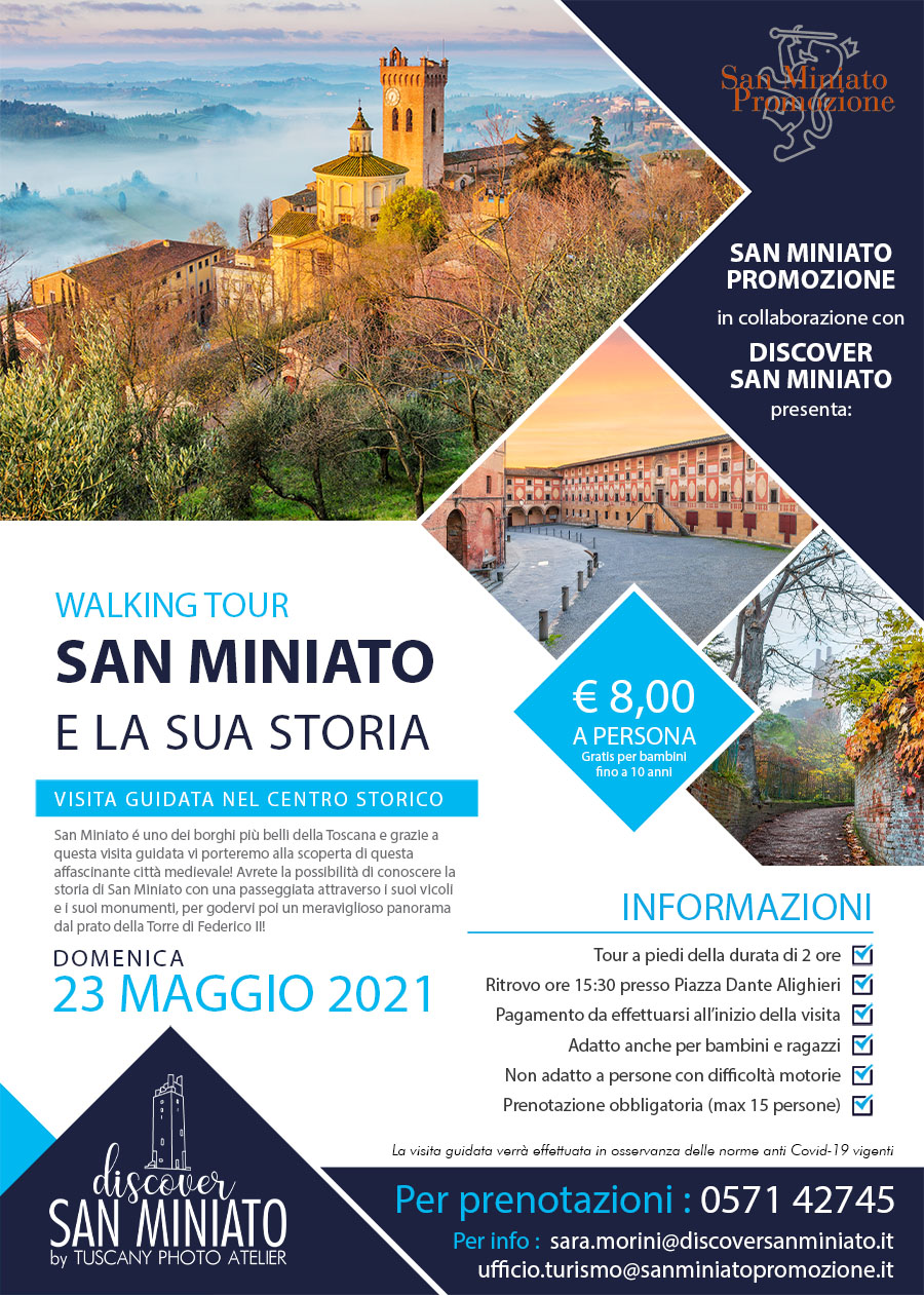 Primo appuntamento - Domenica 23 Maggio 2021"SAN MINIATO E LA SUA STORIA"San Miniato é uno dei borghi più belli della Toscana e grazie a questa visita guidata vi porteremo alla scoperta di questa affascinante città! Avrete la possibilità di conoscere la storia di San Miniato con una passeggiata attraverso i suoi vicoli e i suoi monumenti, per godervi poi un meraviglioso panorama dal prato della Torre di Federico II!