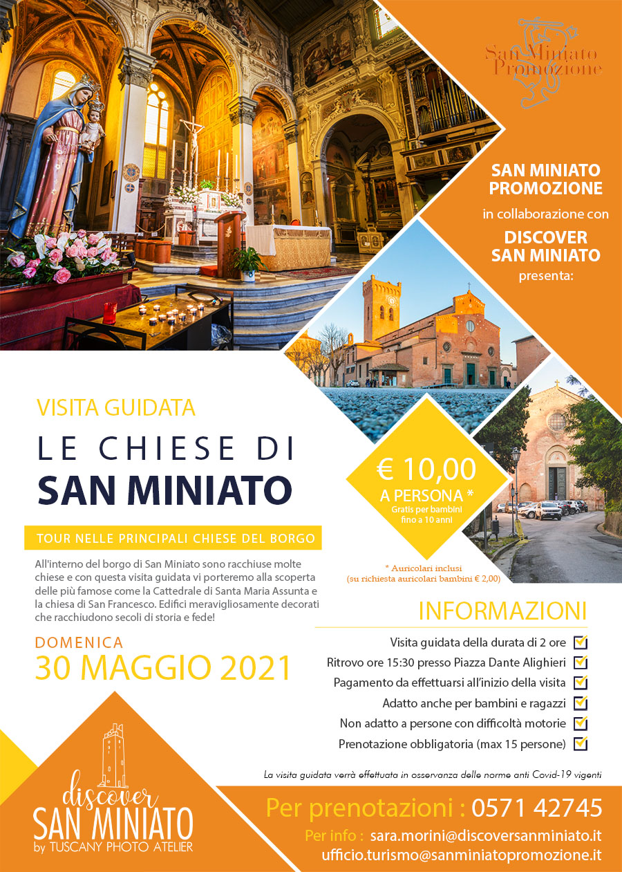 Secondo appuntamento - Domenica 30 Maggio 2021"LE CHIESE DI SAN MINIATO"All’interno del borgo di San Miniato sono racchiuse molte chiese e con questa visita guidata vi porteremo alla scoperta delle più famose come la Cattedrale di Santa Maria Assunta e la chiesa di San Francesco. Edifici meravigliosamente decorati che racchiudono secoli di storia e fede!