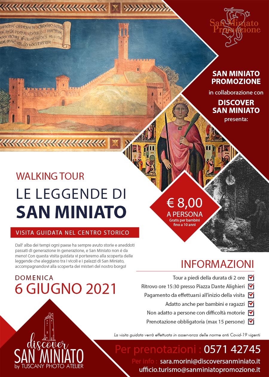 Terzo appuntamento - Domenica 6 Giugno 2021"LE LEGGENDE DI SAN MINIATO"Dall’ alba dei tempi ogni paese ha sempre avuto storie e aneddoti passati di generazione in generazione, e San Miniato non é da meno! Con questa visita guidata vi porteremo alla scoperta delle leggende che aleggiano tra i vicoli e i palazzi di San Miniato, accompagnandovi alla scoperta dei misteri del nostro borgo!