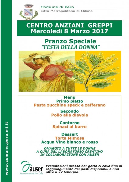 Mercoledi 8 marzo 2017 presso il Centro Greppi un pranzo speciale dedicato alle donne con l'omaggio del laboratorio creativo in collaborazione con Auser, un momento dedicato al mondo femminile e stare in compagnia.