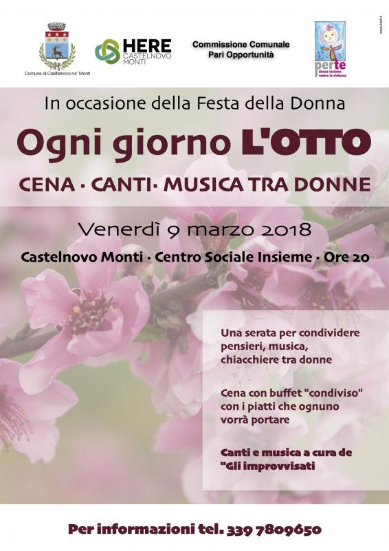 CASTELNOVO MONTI – In occasione della Festa della Donna il Comune di Castelnovo Monti, la Commissione comunale Pari Opportunità e l'Associazione Per te - Donne Insieme contro la violenza hanno organizzato l'iniziativa “Ogni giorno l'otto”, che si svolgerà venerdì, 9 marzo, al Centro sociale Insieme di via dei Partigiani, dalle ore 20. Sarà una serata per condividere pensieri, musica, cibo e chiacchiere tra donne. Ci sarà una cena con buffet condiviso, con i piatti che ciascuno vorrà portare, e poi canti e musica a cura de “Gli Improvvisati”.