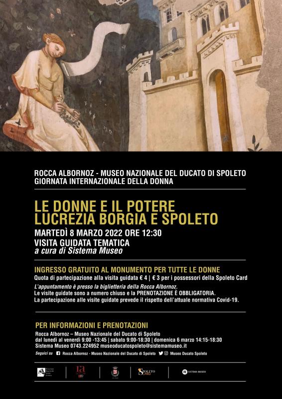 In occasione della Giornata Internazionale della Donna il giorno martedì 8 marzo p.v. è previsto l’ingresso gratuito per le donne nei musei e nei luoghi della cultura statali. Sistema Museo, in collaborazione con la Direzione Regionale Musei dell’Umbria Rocca Albornoz -Museo Nazionale del Ducato di Spoleto, dedica alle ore 12:30 una speciale visita guidata ad una delle figure femminili più discusse della storia, Lucrezia Borgia.