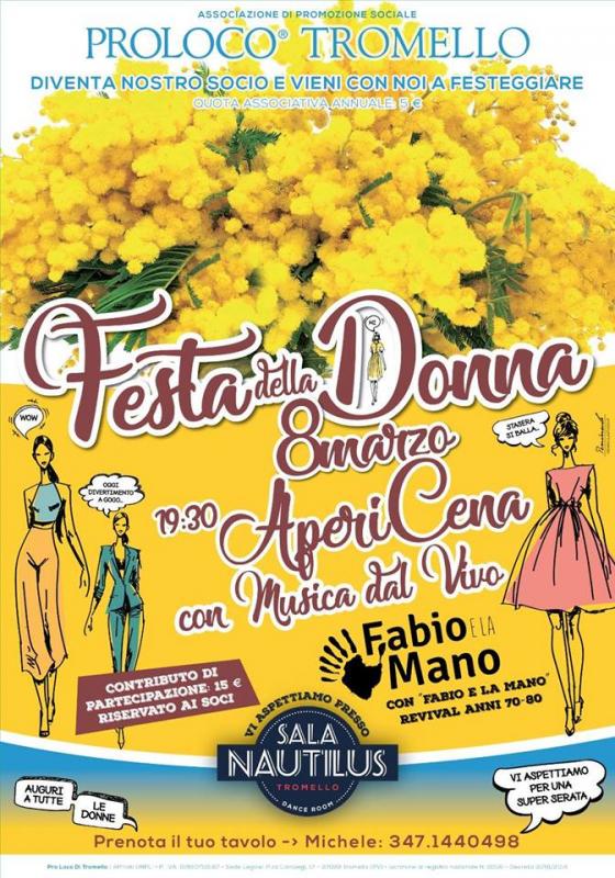 L'8 marzo la Pro Loco di Tromello propone un apericena per la Festa della Donna, con un ricchissimo buffet presso la sala Nautilus dalle ore 19,30.