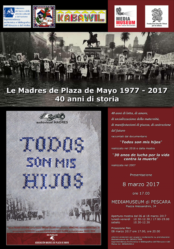 La Soprintendenza Archivistica e Bibliografica dell’Abruzzo e del Molise in collaborazione con l’Associazione Kabawil – El otro soy yo, gruppo di appoggio italiano alle attività dell’Associazione Madres de Plaza de Mayo di Buenos Aires, e con la Fondazione Edoardo Tiboni per la cultura propone la proiezione del documentario "Todos son mis hijos" realizzato in Argentina, sottotitolato in italiano dall’associazione Kabawil di Pescara, in occasione del 40° anniversario delle Madres de Plaza de Mayo.