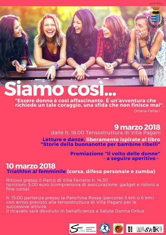 Venerdì 9 marzo, dalle ore 18.00, in collaborazione con l'Associazione Scuola d'Arte il mosaiko, presso la tensostruttura di Villa Pagani, si terrà uno spettacolo liberamente ispirato al libro best seller "Storie della buonanotte per bambine ribelli", a seguire la premiazione del "Volto delle donne" e aperitivo gratuito per tutti.