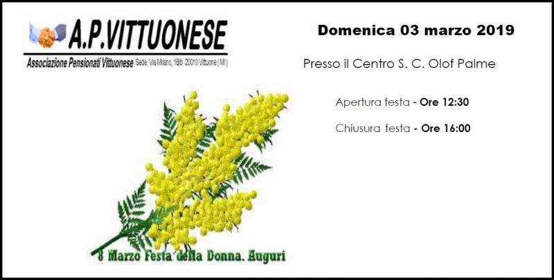 L'Associazione Pensionati Vittuone con il patrocinio del Comune di Vittuone organizza un pranzo dedicato alla Giornata Internazionale della Donna, Domenica 03 Marzo 2019, alle ore 12.30 presso il Centro Socio Culturale Olof Palme.