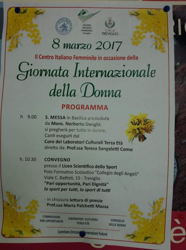 Mercoledì 8 Marzo dalle ore 9 celebrazioni per la festa della donna: Messa in Basilica e conferenza alle ore 10.30 presso il Collegio degli Angeli a cura del CIF, Commissione Pari Opportunità, Laboratori Culturali e Consiglio delle Donne