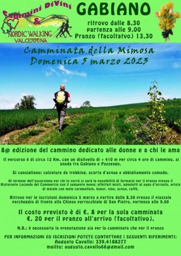 La Camminata della Mimosa giunge alla sua 8@ edizione a cambia leggermente il format, Cammini DiVini ed il Ristorante Commercio di Gabiano in occasione della festa delle donne vi ripropongono questa camminata sui sentieri che da Gabiano attraversano le colline, porta al piccolo borgo di Pozzengo per poi ritornare al punto di partenza.