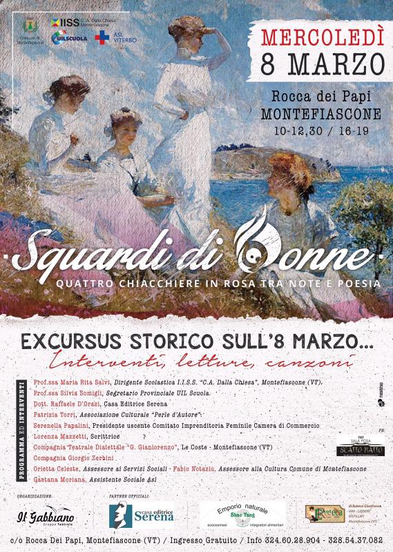 L’8 marzo, in occasione della festa della donna, il gruppo teatrale " Il Gabbiano " organizza, nella suggestiva Rocca dei Papi di Montefiascone, con i patrocini del comune, della UIL scuola e della ASL di Viterbo e la collaborazione dell' I.I.S.S. Dalla Chiesa, un incontro dal titolo Sguardi di donne, quattro chiacchiere in rosa fra Note e Poesia: una giornata dedicata al mondo delle donne per far si che il nostro non sia un mondo contro le donne. " Interverranno autori, editori, musicanti e attori con le loro storie, poesie e musiche, dedicate all' universo femminile, il tutto condiviso dalla follia, dal colore e dalla simpatia del gruppo teatrale " Il Gabbiano ".