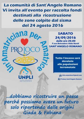 Le Associazioni riunite di Sant'Angelo Romano, ad un mese esatto dal sisma che ha colpito il centro Italia, invitano tutti a partecipare all'iniziativa benefica che si terrà il 24 settembre 2016 in Piazza Belvedere Aldo Nardi, a Sant'Angelo Romano (RM).