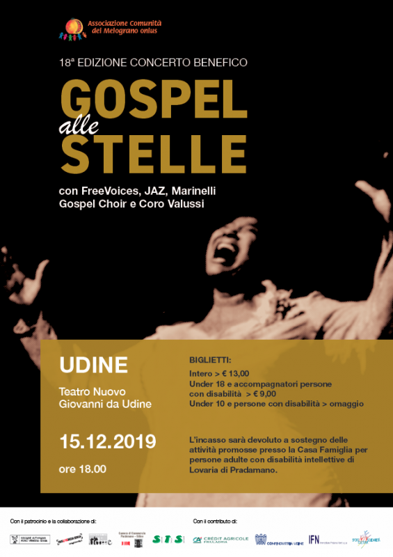 18° concerto benefico “Gospel alle Stelle” il 15 dicembre, alle ore 18.00, presso il Teatro Nuovo “Giovanni da Udine” con incasso interamente devoluto alla Casa Famiglia per persone adulte con disabilità intellettive dell’Associazione Comunità del Melograno Onlus